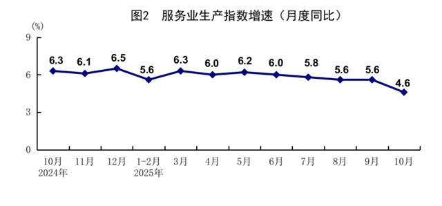 10月份,全国服务业生产指数同比增长4.6%。分行业看,信息传输、软件和信息技术服务业,租赁和商务服务业,金融业生产指数同比分别增长13.0%、8.2%、5.6%,分别快于服务业生产指数8.4、3.6、1.0个百分点。1—10月份,全国服务业生产指数同比增长5.7%。1—9月份,规模以上服务业企业营业收入同比增长7.6%。10月份,服务业商务活动指数为50.2%,服务业业务活动预期指数为56.1%。其中,铁路运输、航空运输、邮政、住宿、文化体育娱乐等行业商务活动指数位于60.0%及以上高位景气区间。