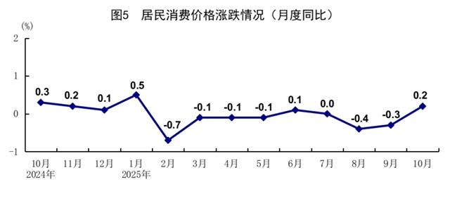 10月份,全国居民消费价格(CPI)同比上涨0.2%,上月为下降0.3%;环比上涨0.2%。分类别看,食品烟酒价格同比下降1.6%,衣着价格上涨1.7%,居住价格上涨0.1%,生活用品及服务价格上涨1.9%,交通通信价格下降1.5%,教育文化娱乐价格上涨0.9%,医疗保健价格上涨1.4%,其他用品及服务价格上涨12.8%。在食品烟酒价格中,猪肉价格下降16.0%,鲜菜价格下降7.3%,鲜果价格下降2.0%,粮食价格下降0.7%。扣除食品和能源价格后的核心CPI同比上涨1.2%,涨幅比上月扩大0.2个百分点。1—10月份,全国居民消费价格同比下降0.1%。