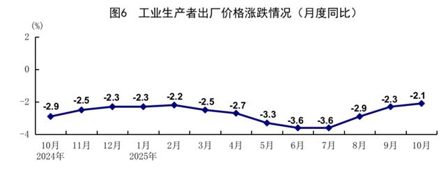 10月份,全国工业生产者出厂价格同比下降2.1%,降幅比上月收窄0.2个百分点,环比上涨0.1%;全国工业生产者购进价格同比下降2.7%,降幅收窄0.4个百分点,环比上涨0.1%。1—10月份,全国工业生产者出厂价格和购进价格同比分别下降2.7%、3.2%。