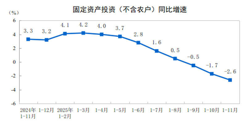 2025年1—11月份,全国固定资产投资(不含农户)444035亿元,同比下降2.6%(按可比口径计算,详见附注7)。其中,民间固定资产投资同比下降5.3%。从环比看,11月份固定资产投资(不含农户)下降1.03%。