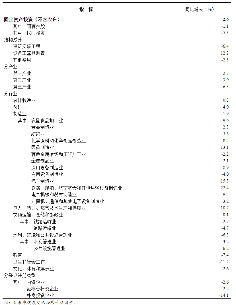 分登记注册类型看,内资企业固定资产投资同比下降2.6%,港澳台企业固定资产投资下降2.2%,外商企业固定资产投资下降14.1%。