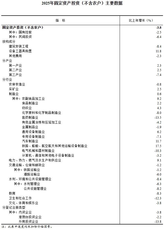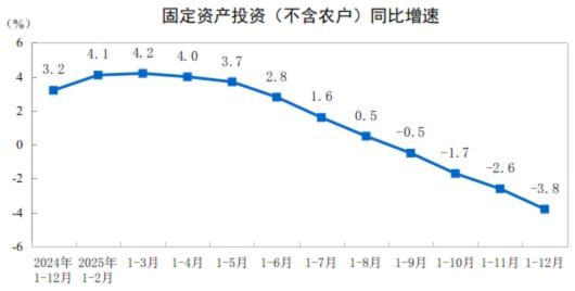 2025年,全国固定资产投资(不含农户)485186亿元,比上年下降3.8%(按可比口径计算,详见附注7)。其中,民间固定资产投资比上年下降6.4%。从环比看,12月份固定资产投资(不含农户)下降1.13%。