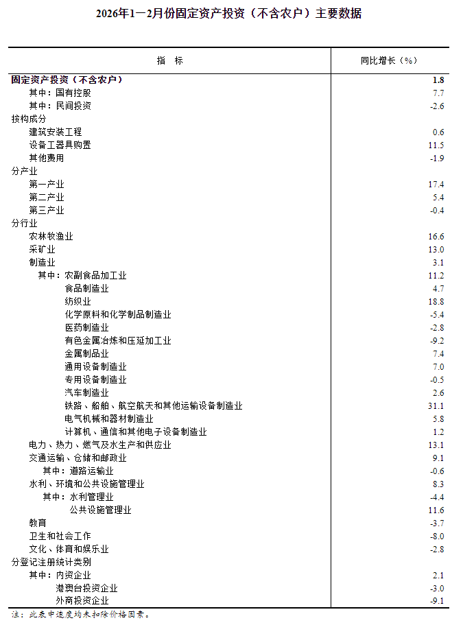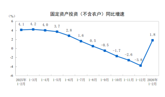 1—2月份,全国固定资产投资(不含农户)52721亿元,同比增长1.8%(按可比口径计算,详见附注7)。其中,民间固定资产投资同比下降2.6%。从环比看,2月份固定资产投资(不含农户)增长0.39%。