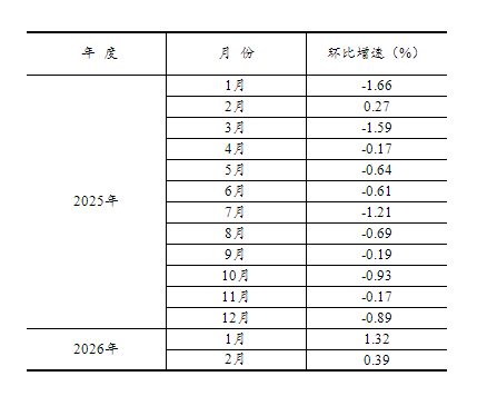 根据季节调整模型自动修正结果,对2025年1月份至12月份固定资产投资(不含农户)环比增速进行修订。修订结果及2026年1、2月份环比数据如下: